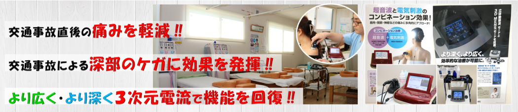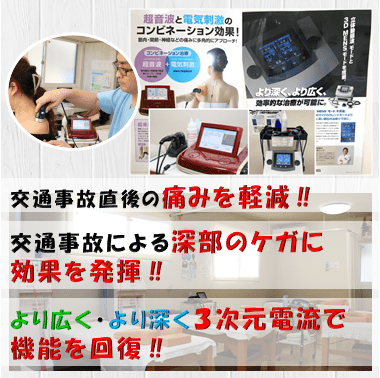 いちょう通り接骨院ではこの効果的な特殊医療機器と専門機関で習得した技術を用い院長が直接リハビリすることにより交通事故後に残ってしまった辛い後遺症を解決していきます。